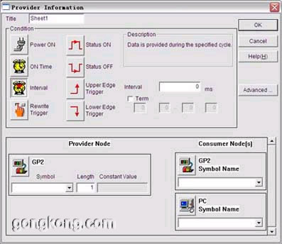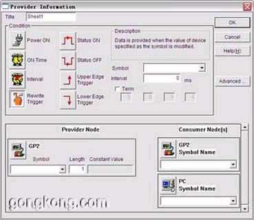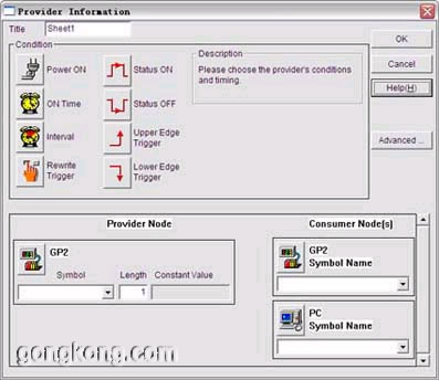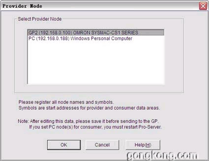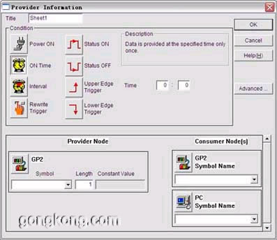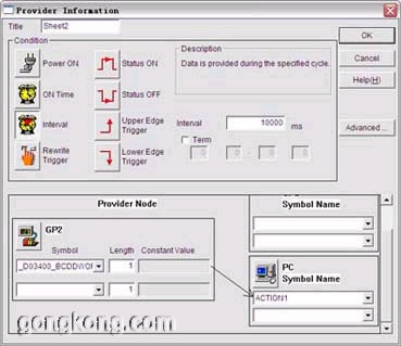 下圖表示每隔10000ms就將GP2節(jié)點上地址D03400的BCDWORD傳給PC節(jié)點,在PC節(jié)點上執(zhí)行ACTION1。