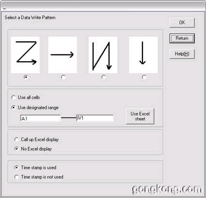 * Select a Data Write Pattern的四個選項分別表示:每次存檔的一組數據以行排列,每組數據以列排列;數據橫排;每次存檔的一組數據以列排列,每組數據以行排列;數據豎排。