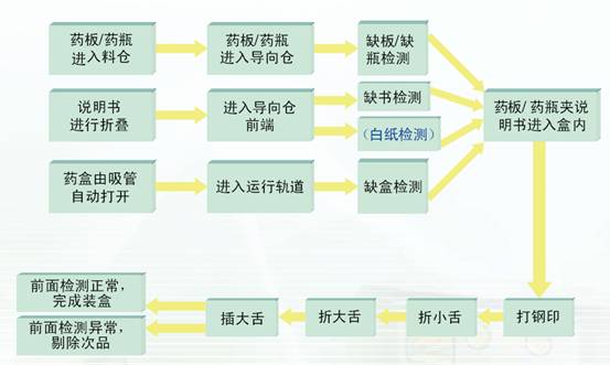 自動裝盒機進料一般分為三個入口:說明書入口、藥瓶/藥板入口和機包盒入口。從機包盒進料到最后包裝成型的整個過程大致可以分成四個階段:下盒、打開、裝填、合蓋。下盒動作通常是由一個吸盤從紙盒進料口吸取一個紙盒,下行到裝盒的主線上,由一個導軌卡位將紙盒固定并用一個推板打開紙盒,同時會有兩個可向前移動的卡位從下面升起,從前后方向卡住紙盒的側面,使盒子打開成直角并前移到裝填區域。在裝填區域填裝后,機器的機構會將耳朵折進左右的導軌中,然后再進行合蓋動作。