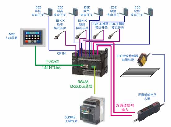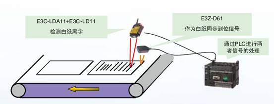 如工藝流程圖所示,在檢測環節中的白紙檢測主要用于檢測說明書中是否有夾雜白紙的功能,由于藥品說明書上的字一般都印刷得比較小,有時行與行之間的間隙較大,因此很難用一般光纖傳感器進行檢測,OMRON的E3C系列激光傳感器中有線型光源,能靈敏地檢測到說明書上每行細小的字體,經過實踐證明能很好地幫助客戶實現白紙檢測功能。