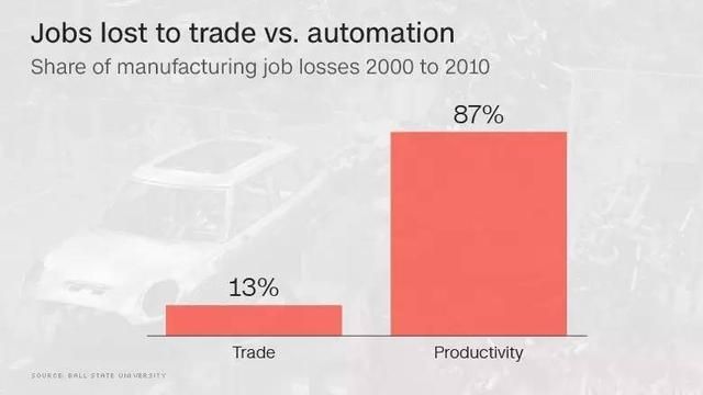 據(jù)CNN,麻省理工大學(xué)經(jīng)濟(jì)學(xué)家(David Autor)研究發(fā)現(xiàn),1999年至2011年中美貿(mào)易減少美國制造業(yè)98.5萬崗位,經(jīng)濟(jì)學(xué)家斯科特(Robert Scott)研究發(fā)現(xiàn),1997年至2013年年間,美國與墨西哥之間貿(mào)易減少了制造業(yè)80萬工作崗位。