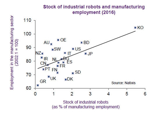 不過對于自動化是否會沖擊就業,也有人并不認同。法國Natixis銀行認為,自2002年至2016年,隨著工業機器人的增加,制造業就業也隨之增加。制造業的自動化最后非但不會破壞就業,還能在其它部門創造更多就業: