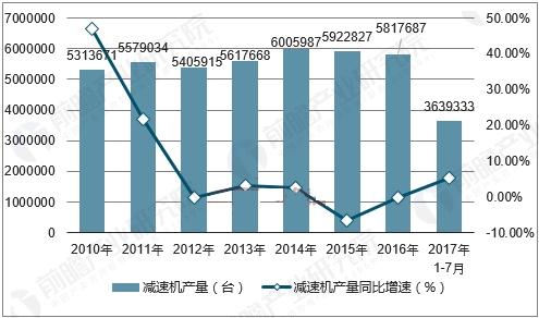 我國減速機產(chǎn)量于2010-2015年總體呈增長趨勢。據(jù)前瞻數(shù)據(jù)庫顯示,2016年中國減速機產(chǎn)量為581.8萬臺,同比下降0.26%。2017年1-7月中國減速機產(chǎn)量為363.9萬臺,同比增長5.3%;其中,7月全國減速機產(chǎn)量為55.3萬臺,當(dāng)月同比增速4.44%。